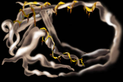 不思議な蝶の妖精、リリスの後をついていくと、次第に森の奥は 荒れ果てた風景に 変わっていった。 深い緑だった常緑樹の葉は茶色くちじれ、大きな幹はねじれ倒れている。 その荒れような奥に行けば行くほどひどくなっていく。 いったい、これはどうしたことなのだろう。 ぼくは焦げたような匂いをさせている下草を踏みながら、リリスの後を急いだ。 すると、荒れ果てた森の中に一カ所だけ空へとそびえる大木があるのが見えた。